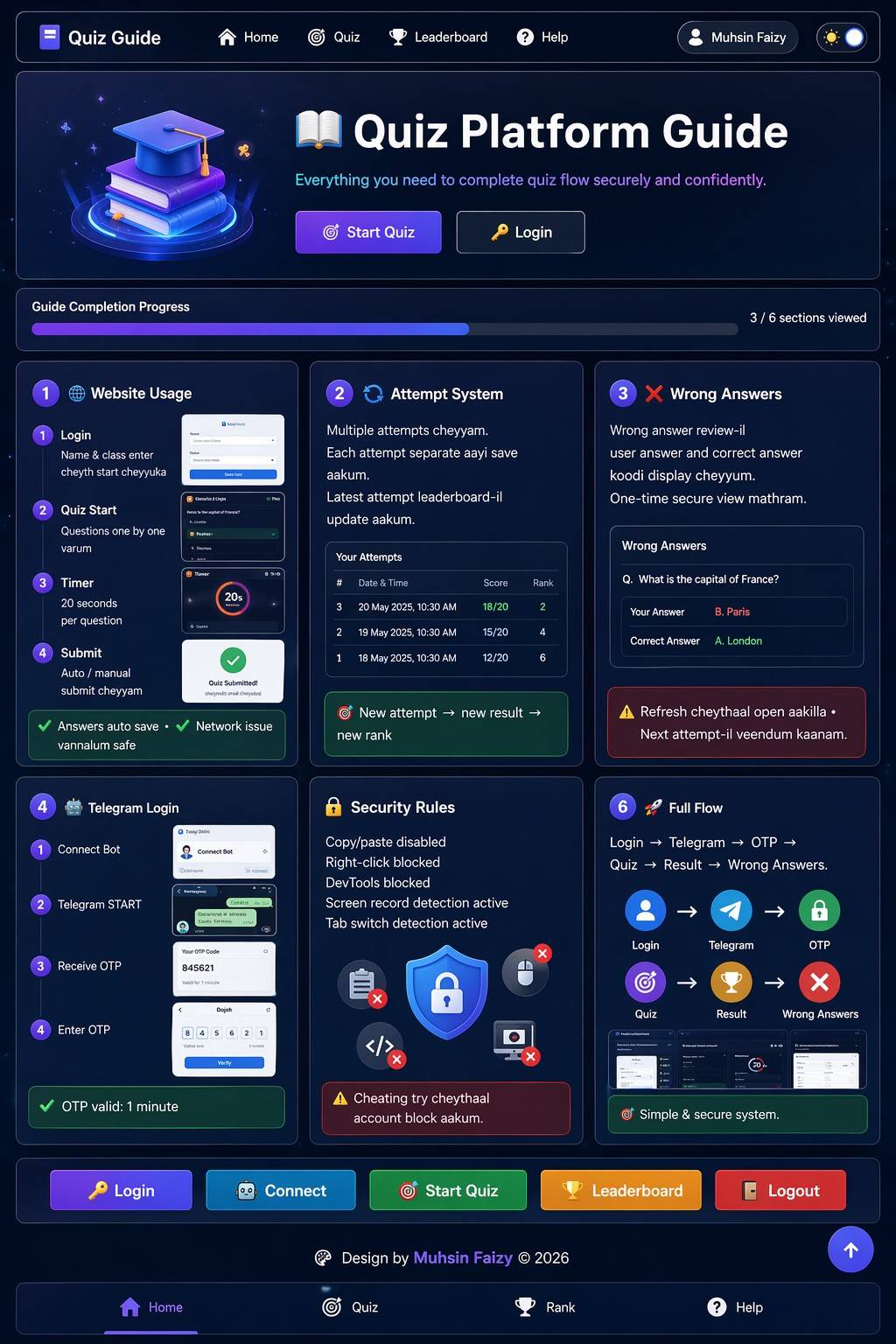 Login → Telegram → OTP → Quiz → Result → Wrong Answers.