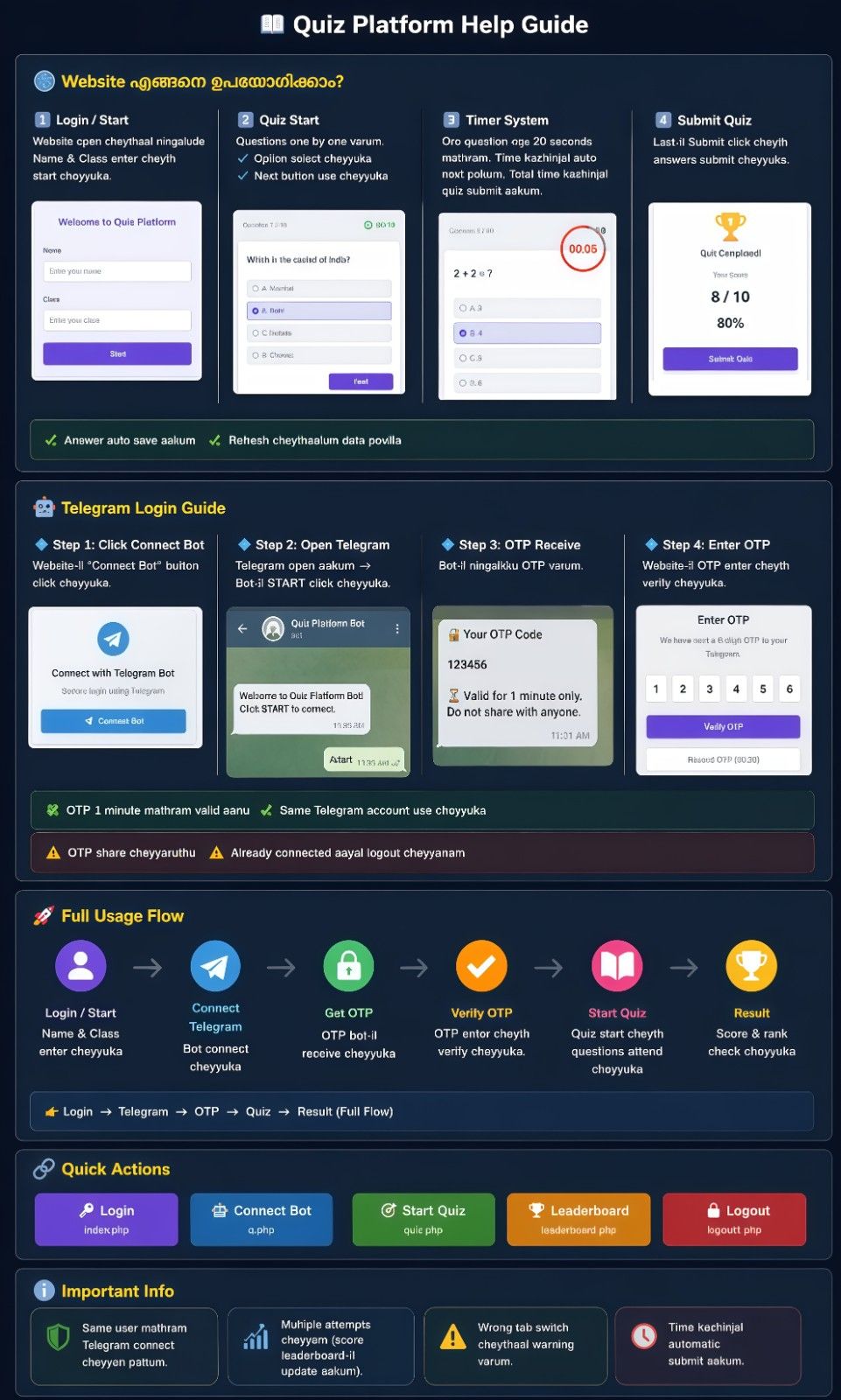 Login → Telegram → OTP → Quiz → Result → Wrong Answers.